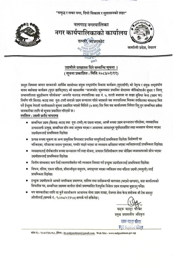उद्यमीले दरखास्त दिने सम्बन्धि सूचना |