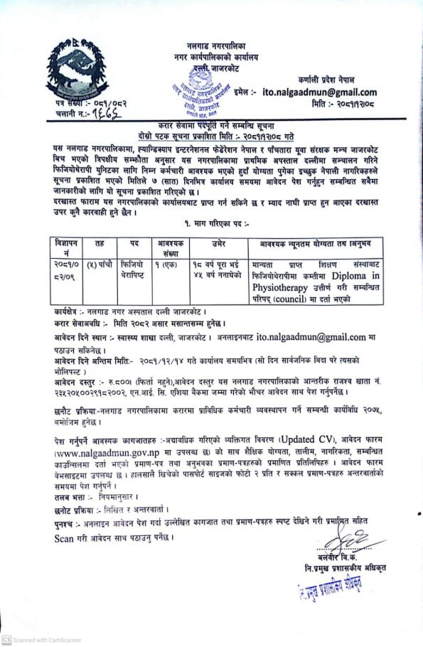 करार सेवामा पर्दपूर्ति गर्ने सम्बन्धि सूचना (फिजियोथेरापिष्ट )