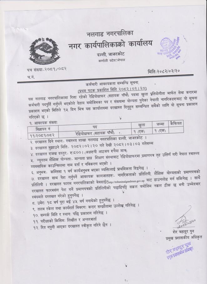 कर्मचारी आवश्यकता सम्बन्धि सूचना, (रेडियोग्राफर सहायक पाँचौ)