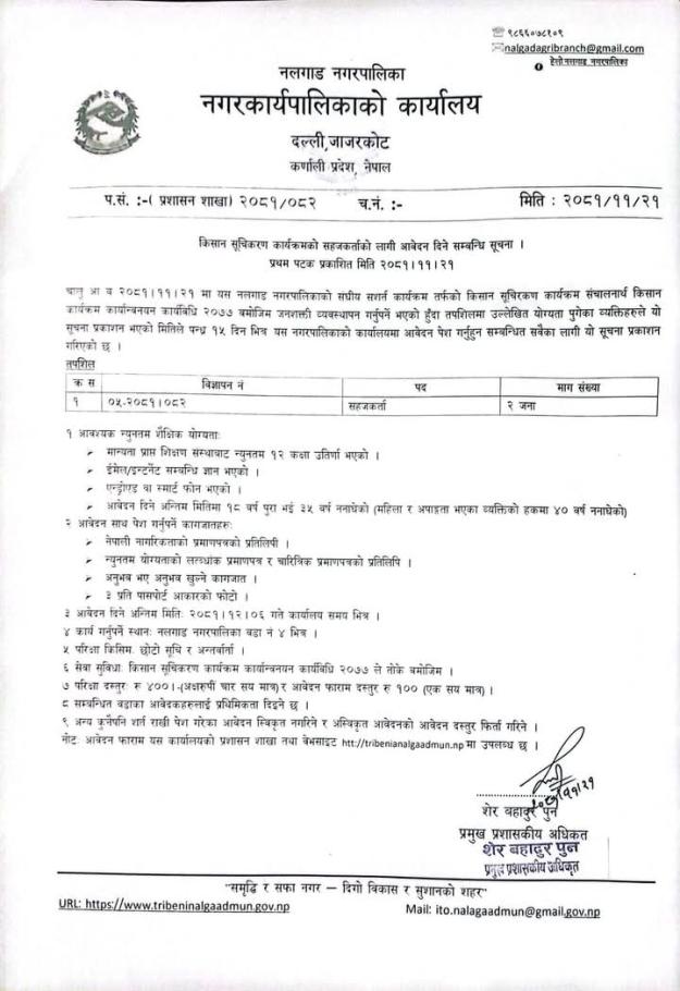 किसान सूचिकरण कार्यक्रमको सहजकर्ताको लागी आवेदन दिने सम्बन्धि सूचना ।