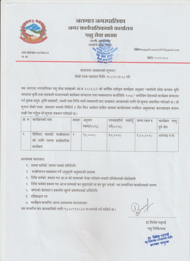 विशिष्ट जातको पंन्छीपालन को लागी प्रस्ताव आव्हान सम्बन्धि सूचना | (दोस्रो पटक)