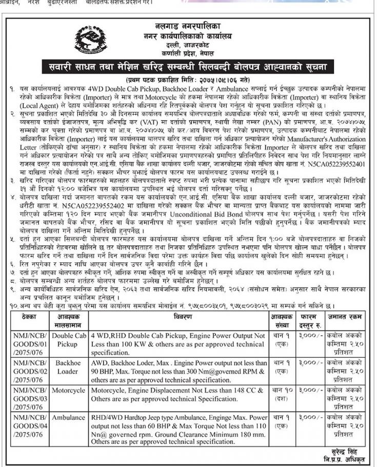 सवारी साधन तथा मेशिन खरिद सम्बन्धी सिलबन्दी बोलपत्र आह्वानको सूचना