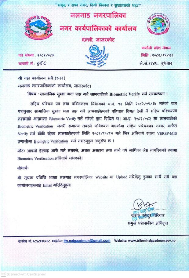 सामाजिक सुरक्षा भत्ता प्राप्त गर्ने लाभग्राहीको Biometric Verify गर्ने सम्बन्धमा ।